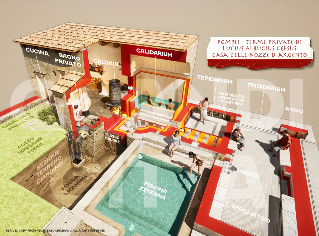 Schema di domus romana con terme, cucina e servizi igienici I sec. d.C.